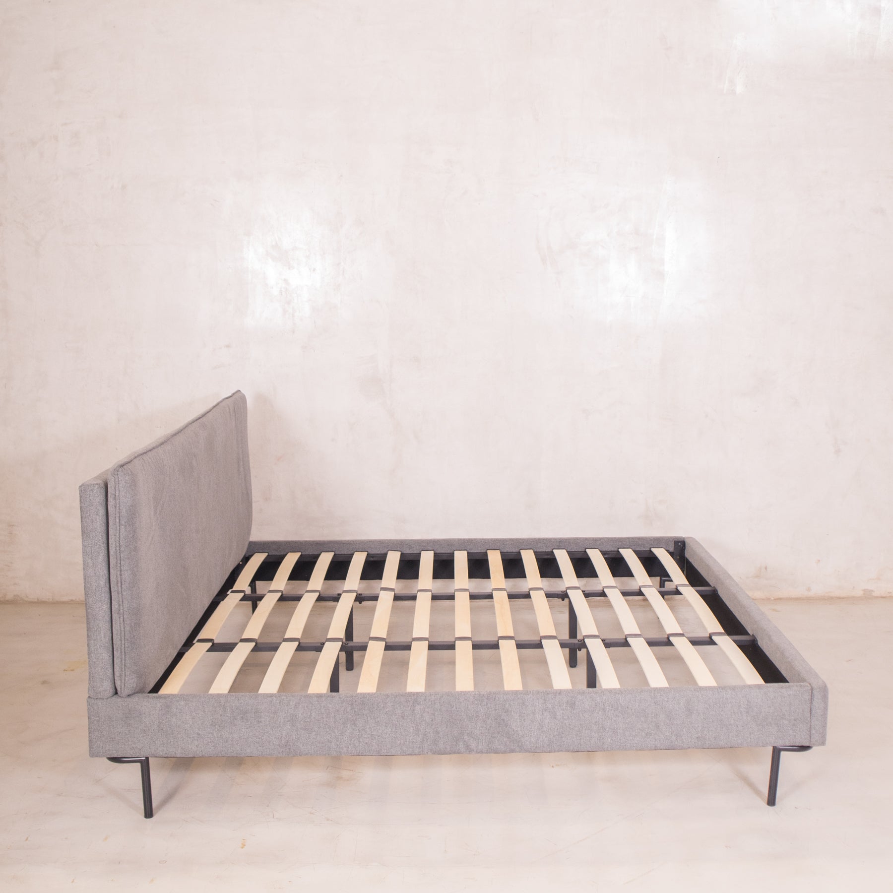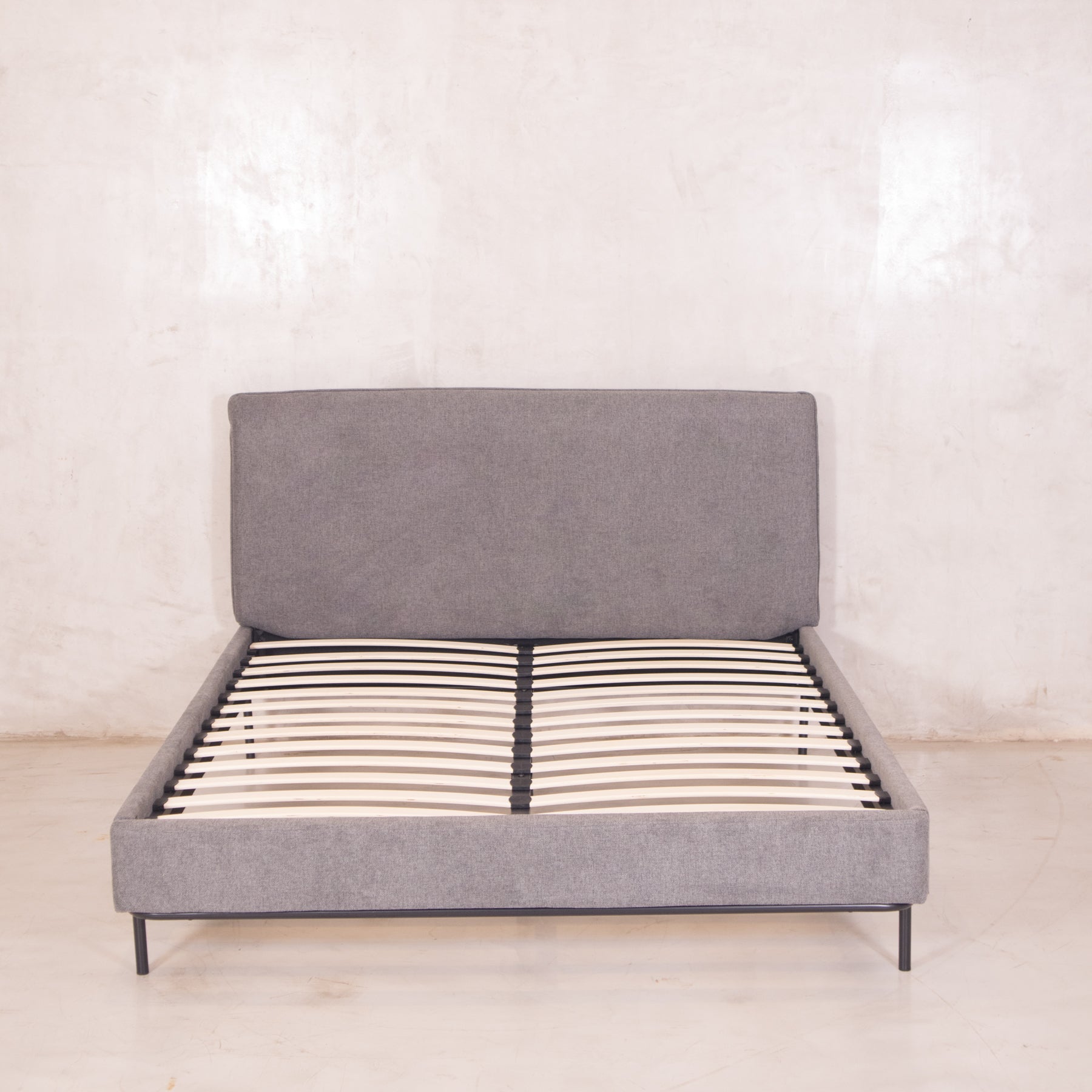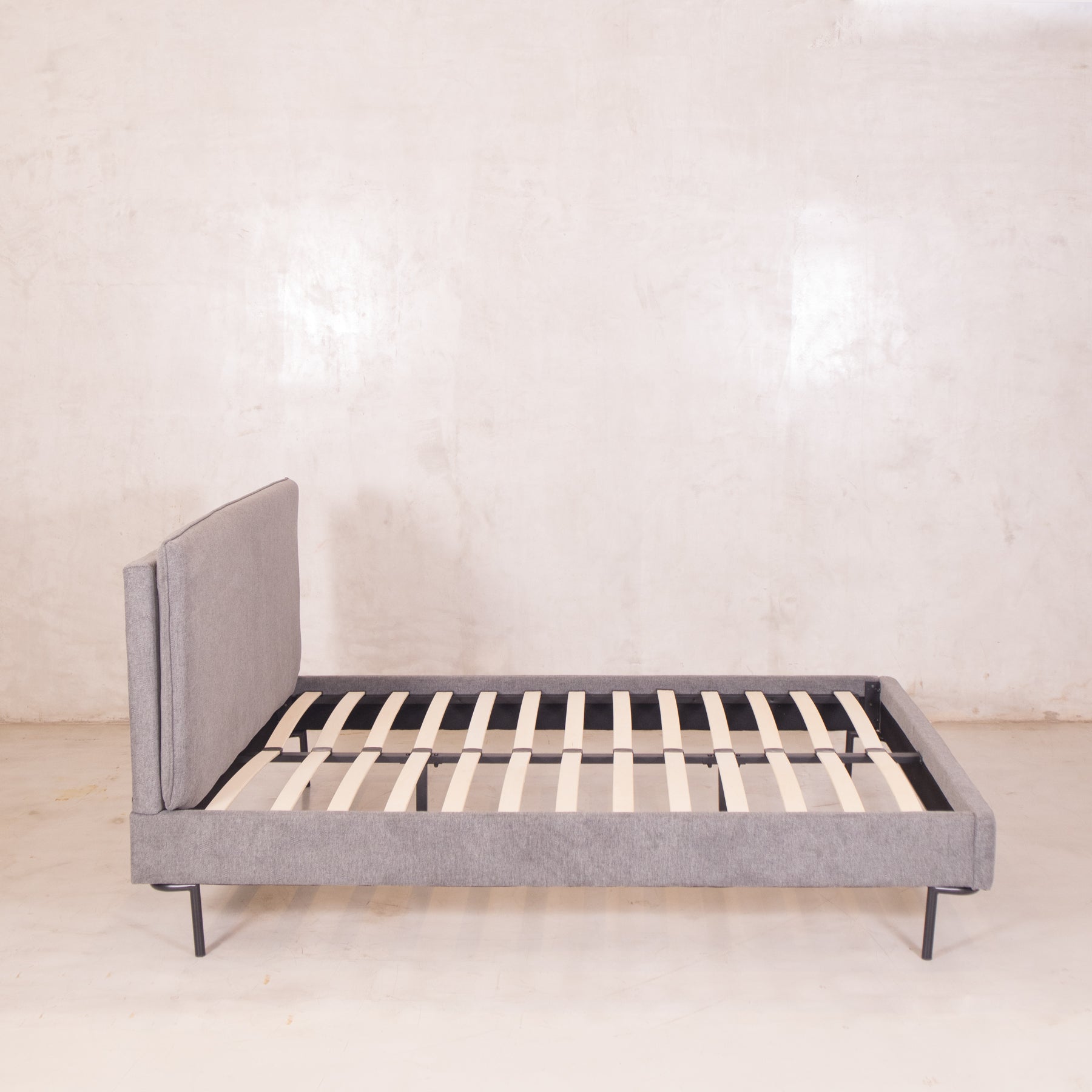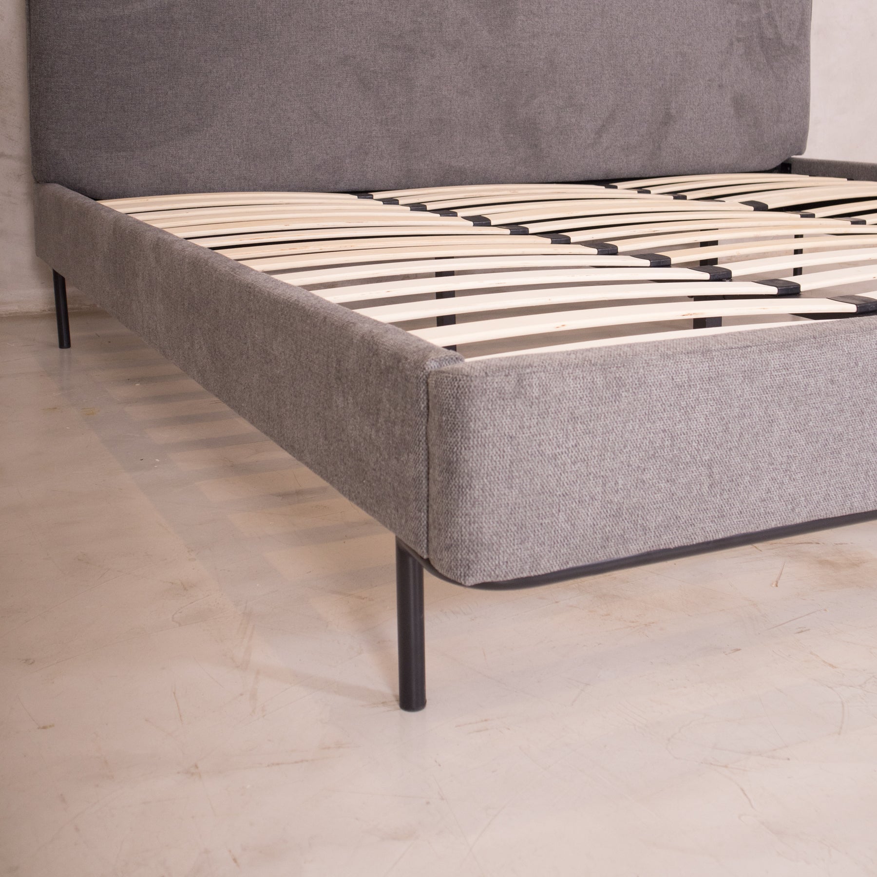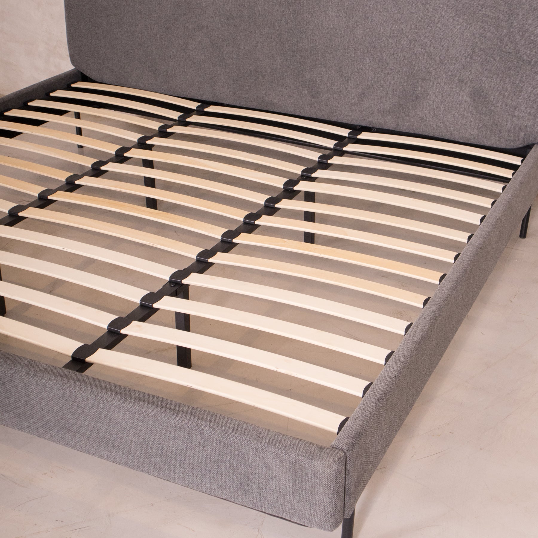El tapiz en tela linato color gris aporta una textura suave y neutra, perfecta para combinar con cualquier decoración. Además, su base incluye tablas de madera maciza y herrajes metálicos, brindando el soporte ideal para tu colchón sin necesidad de box spring.