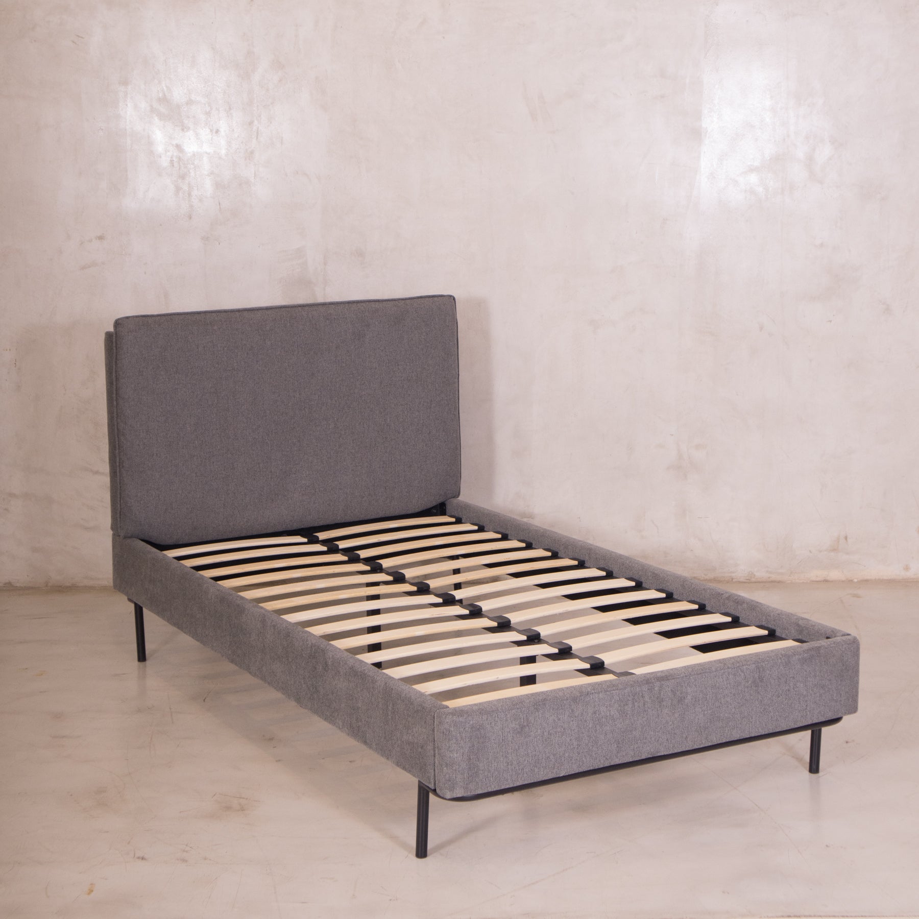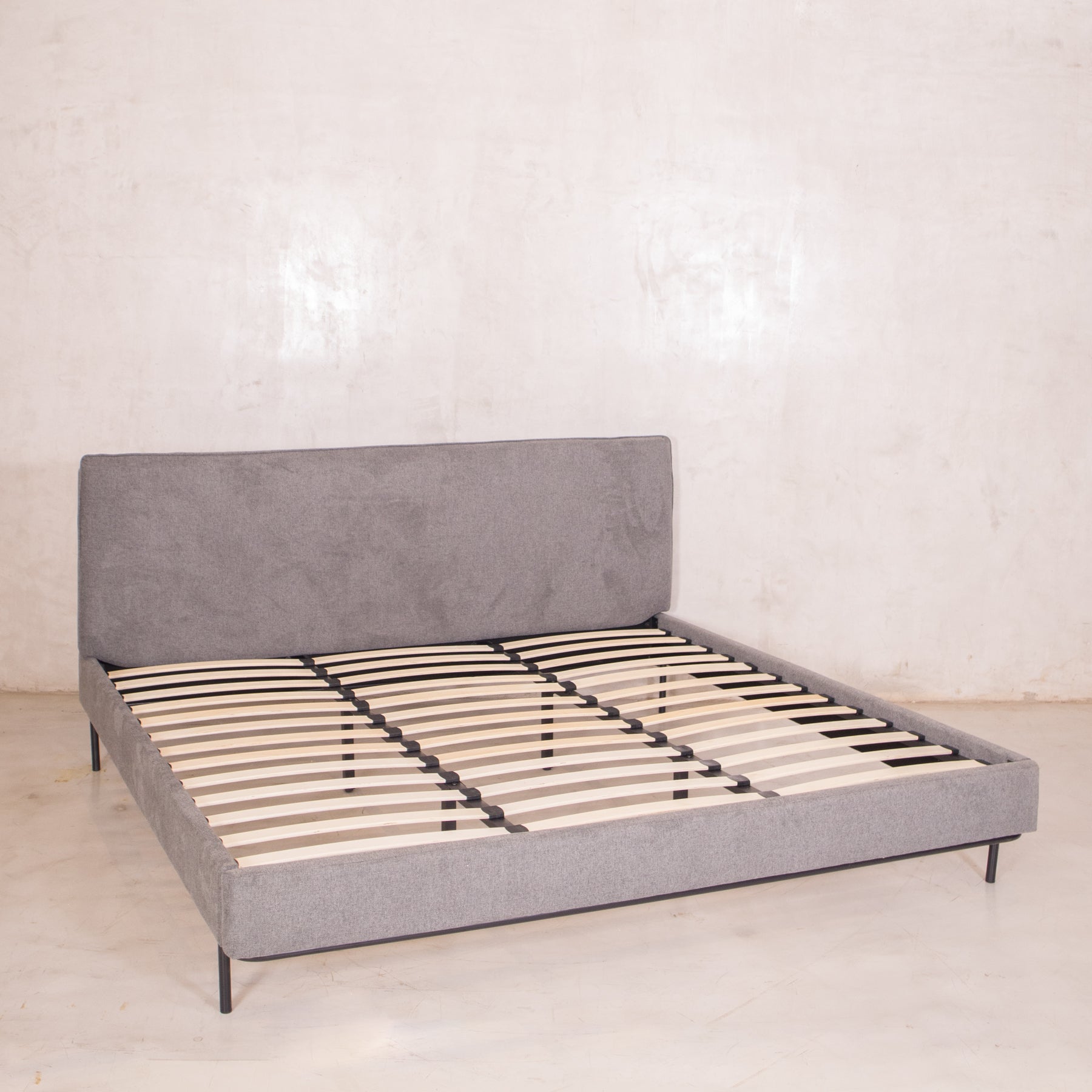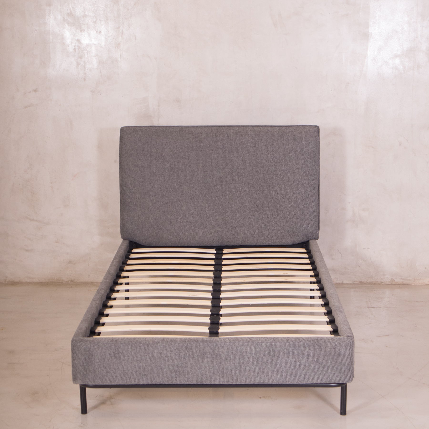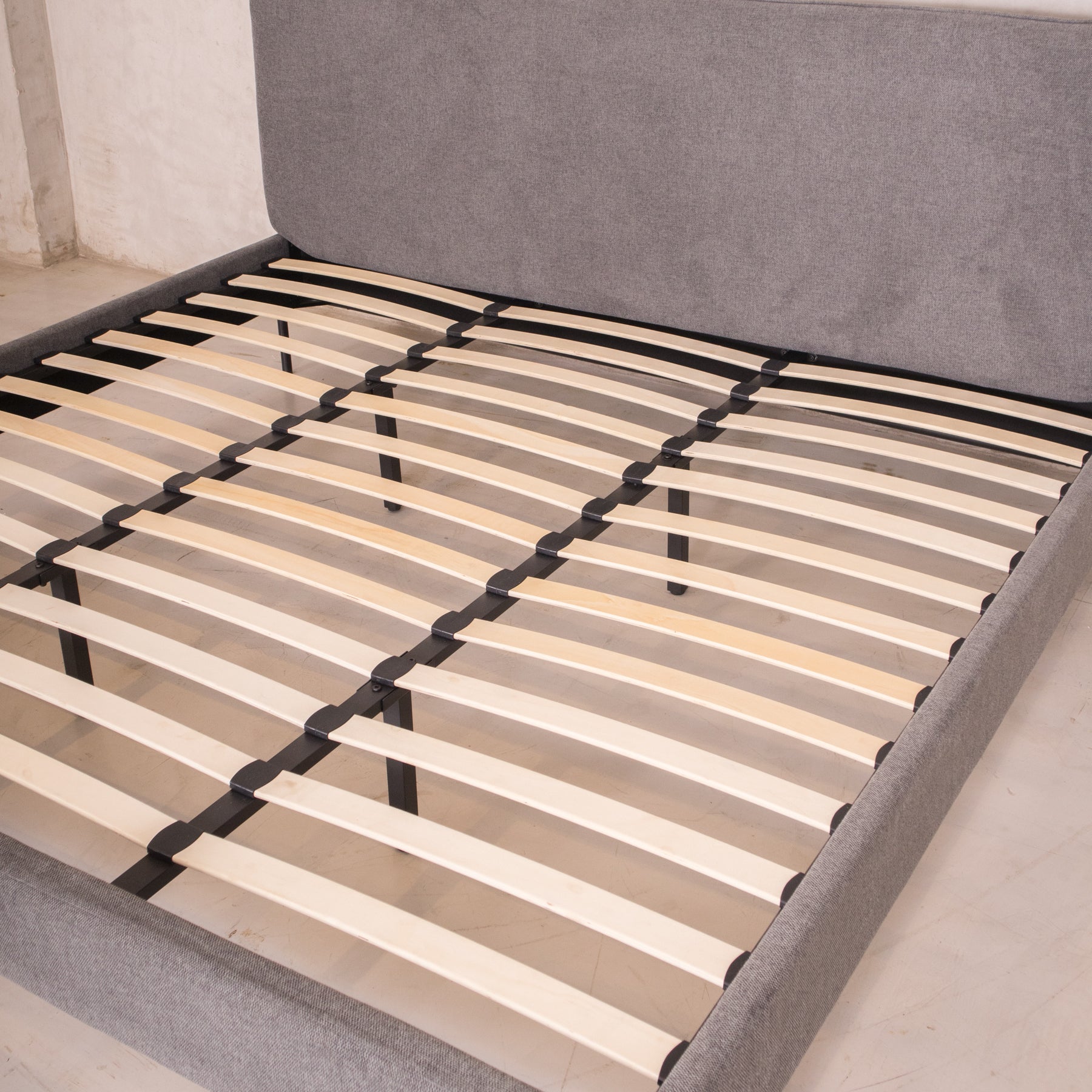 El tapiz en tela linato color gris aporta una textura suave y neutra, perfecta para combinar con cualquier decoración. Además, su base incluye tablas de madera maciza y herrajes metálicos, brindando el soporte ideal para tu colchón sin necesidad de box spring.