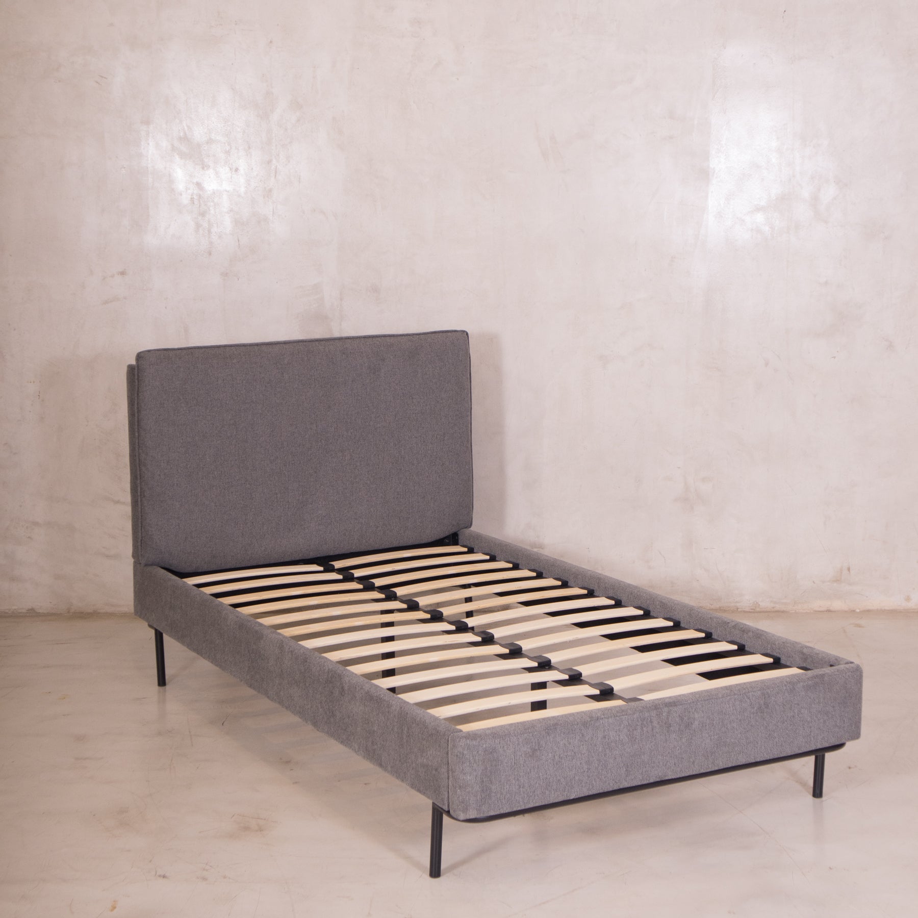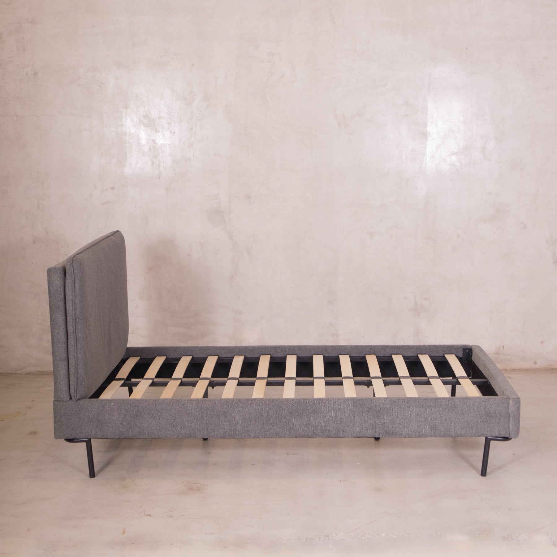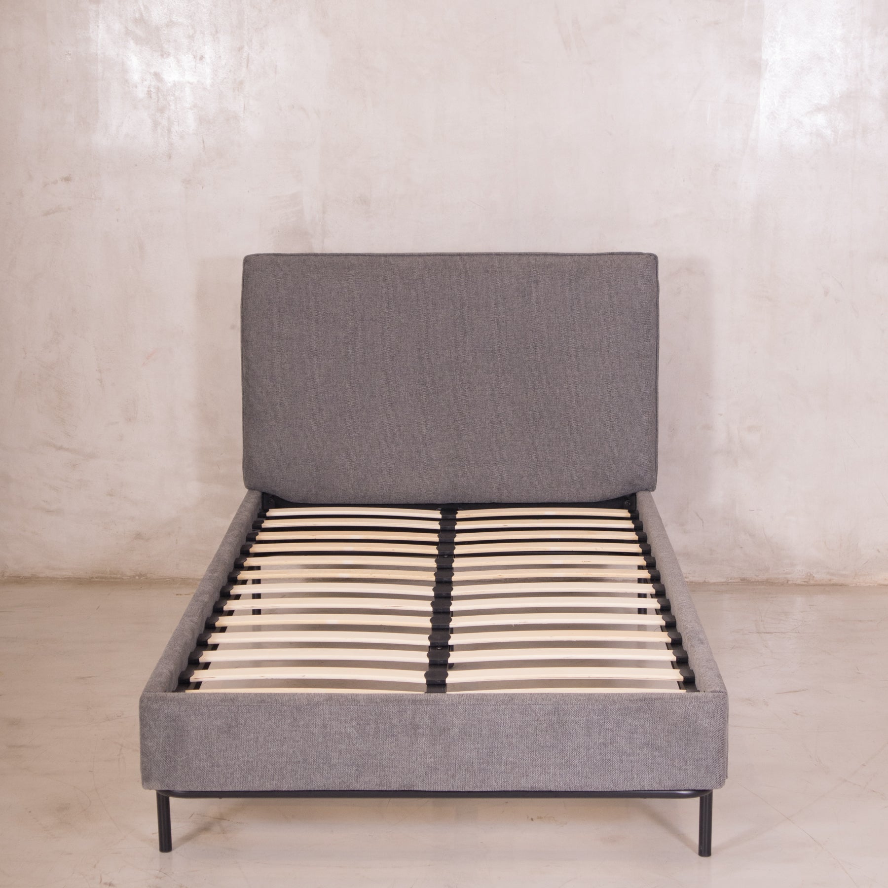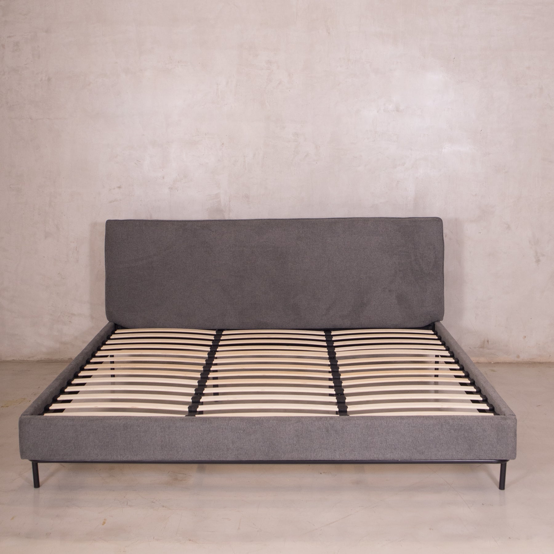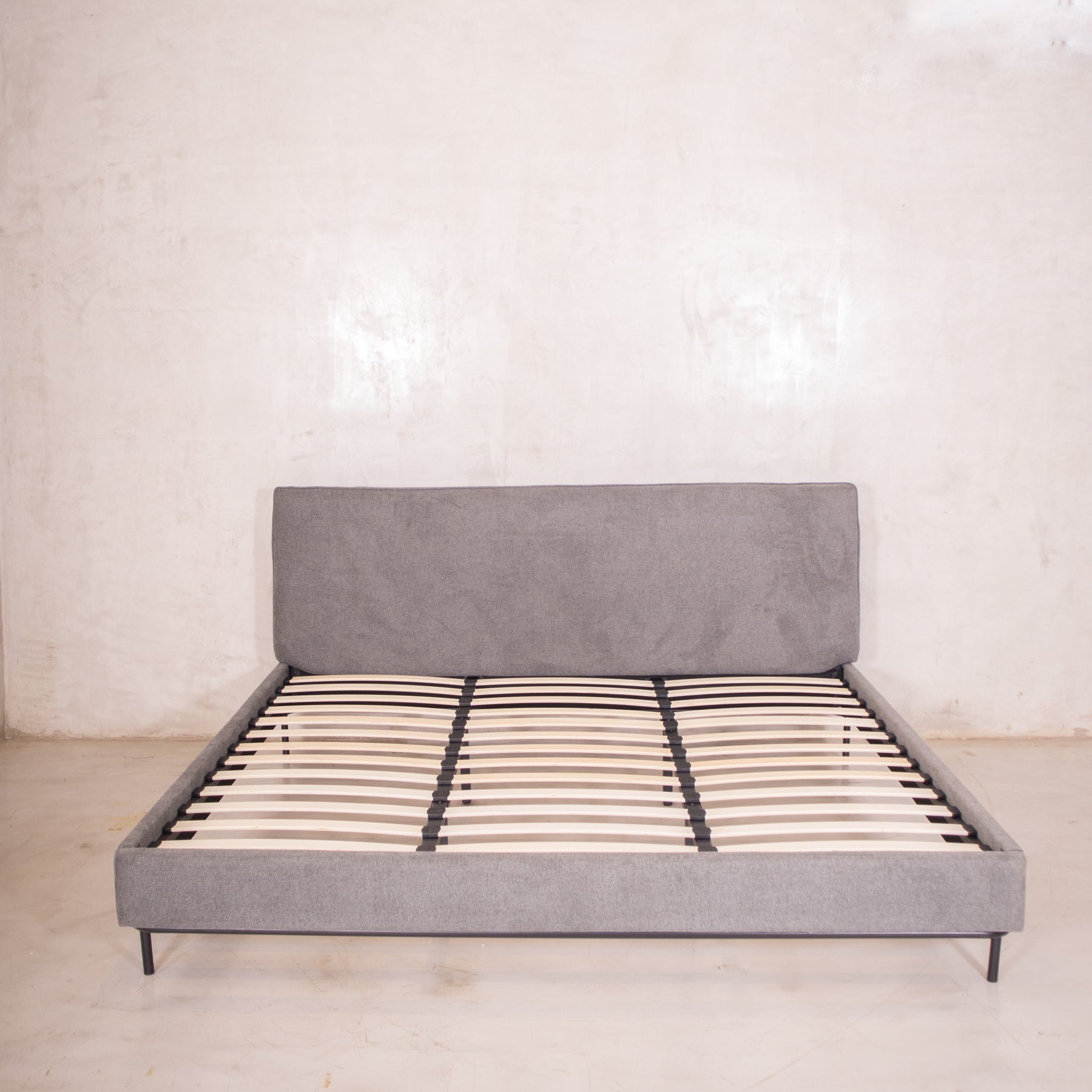 El tapiz en tela linato color gris aporta una textura suave y neutra, perfecta para combinar con cualquier decoración. Además, su base incluye tablas de madera maciza y herrajes metálicos, brindando el soporte ideal para tu colchón sin necesidad de box spring.