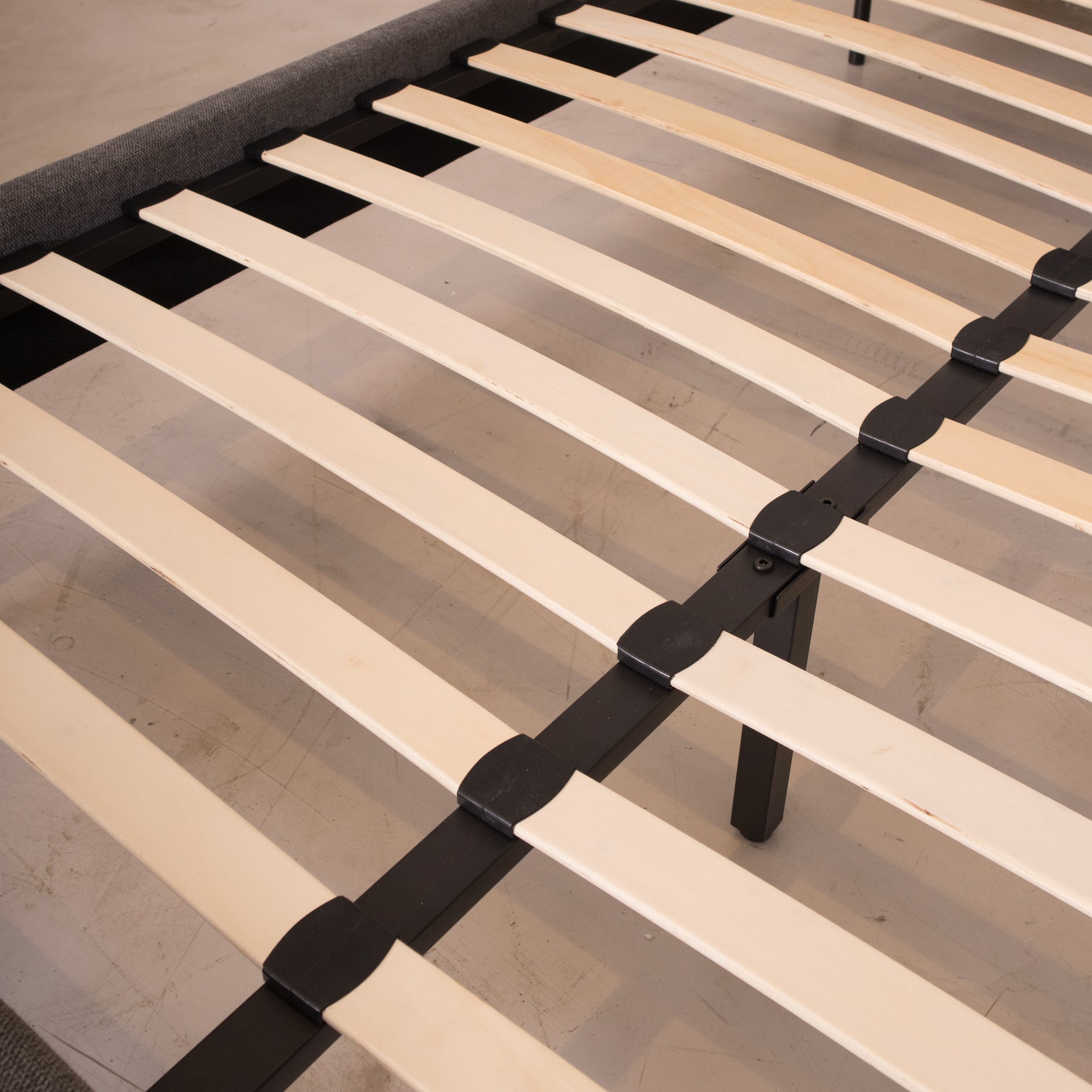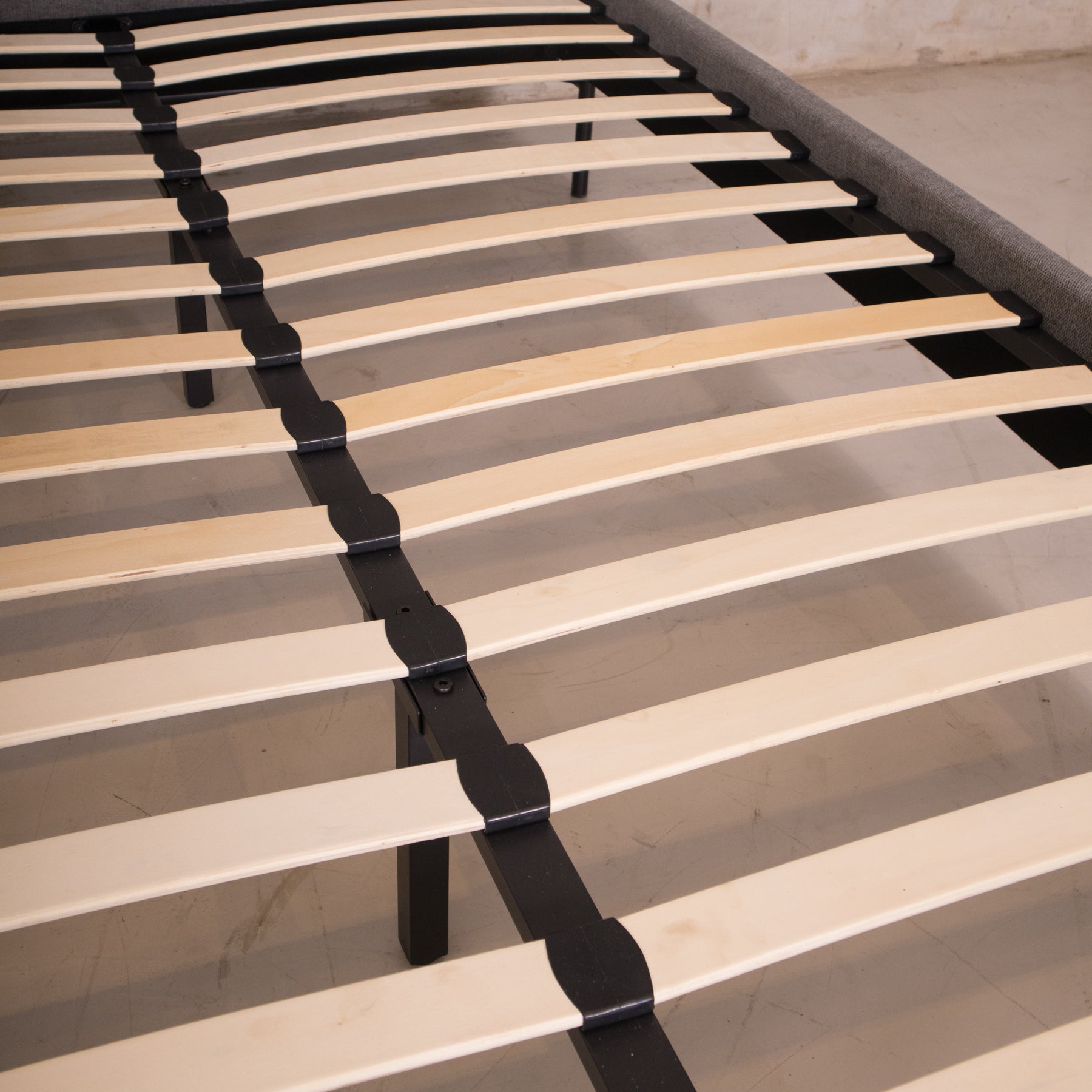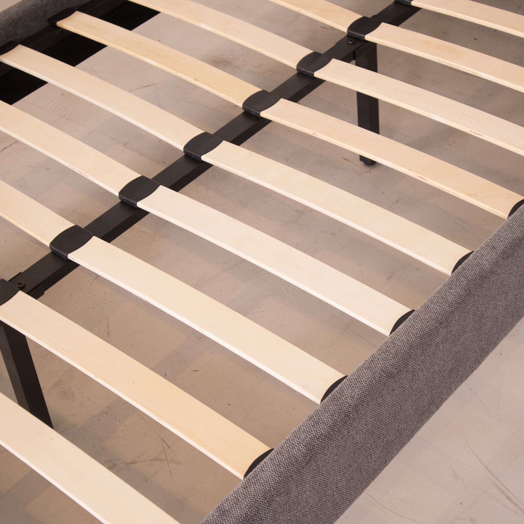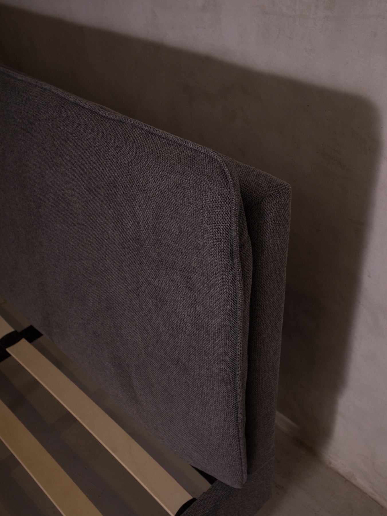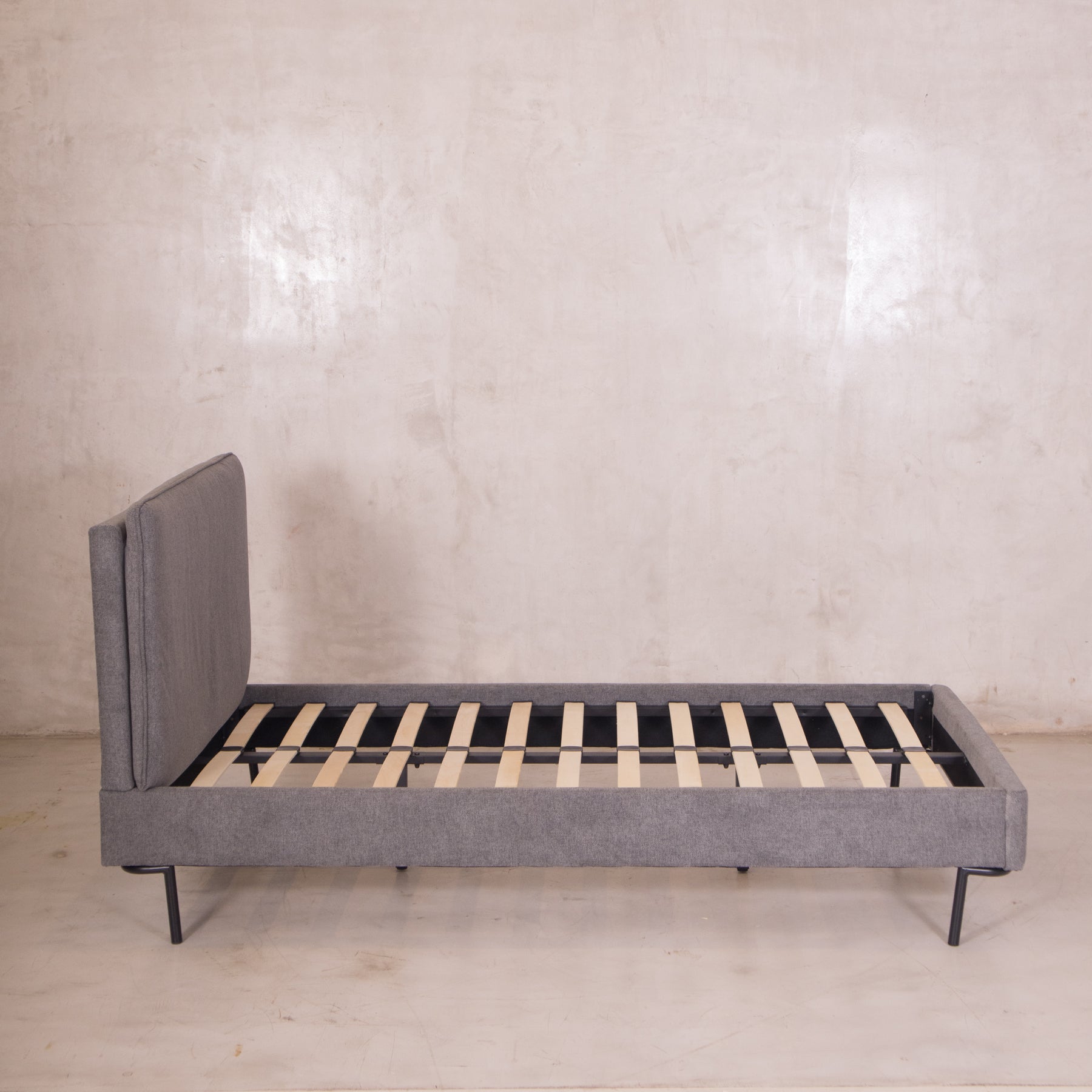 El tapiz en tela linato color gris aporta una textura suave y neutra, perfecta para combinar con cualquier decoración. Además, su base incluye tablas de madera maciza y herrajes metálicos, brindando el soporte ideal para tu colchón sin necesidad de box spring.